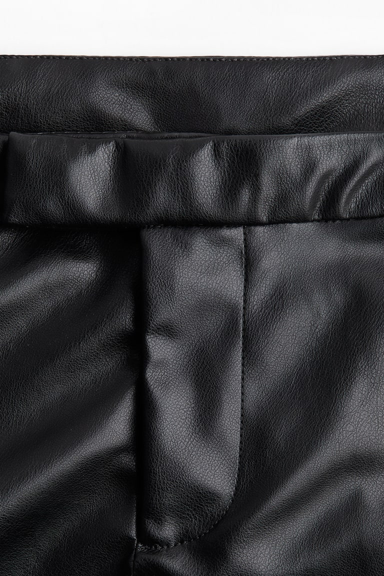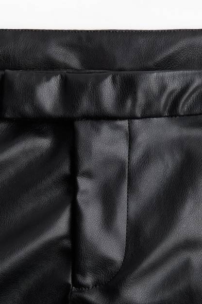 Fitted mini shorts in coated fabric. Extended waistband tab with concealed hook-and-bar fastener, zip fly, and diagonal side pockets.