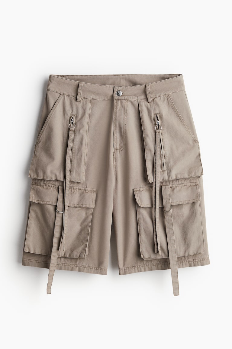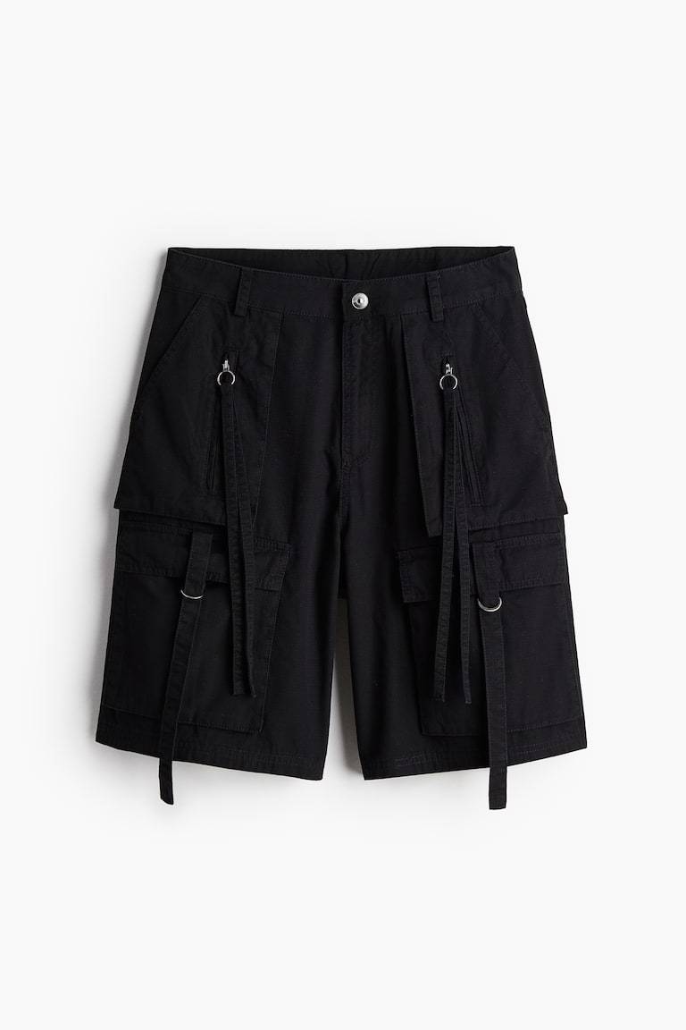 Loose-fit, knee-length shorts in woven cotton fabric. Zip fly with button. Patch front pockets with an outer pocket with zipper and long zipper pulls, open back pockets, and bellows leg pockets with flap, strap, and D-ring.