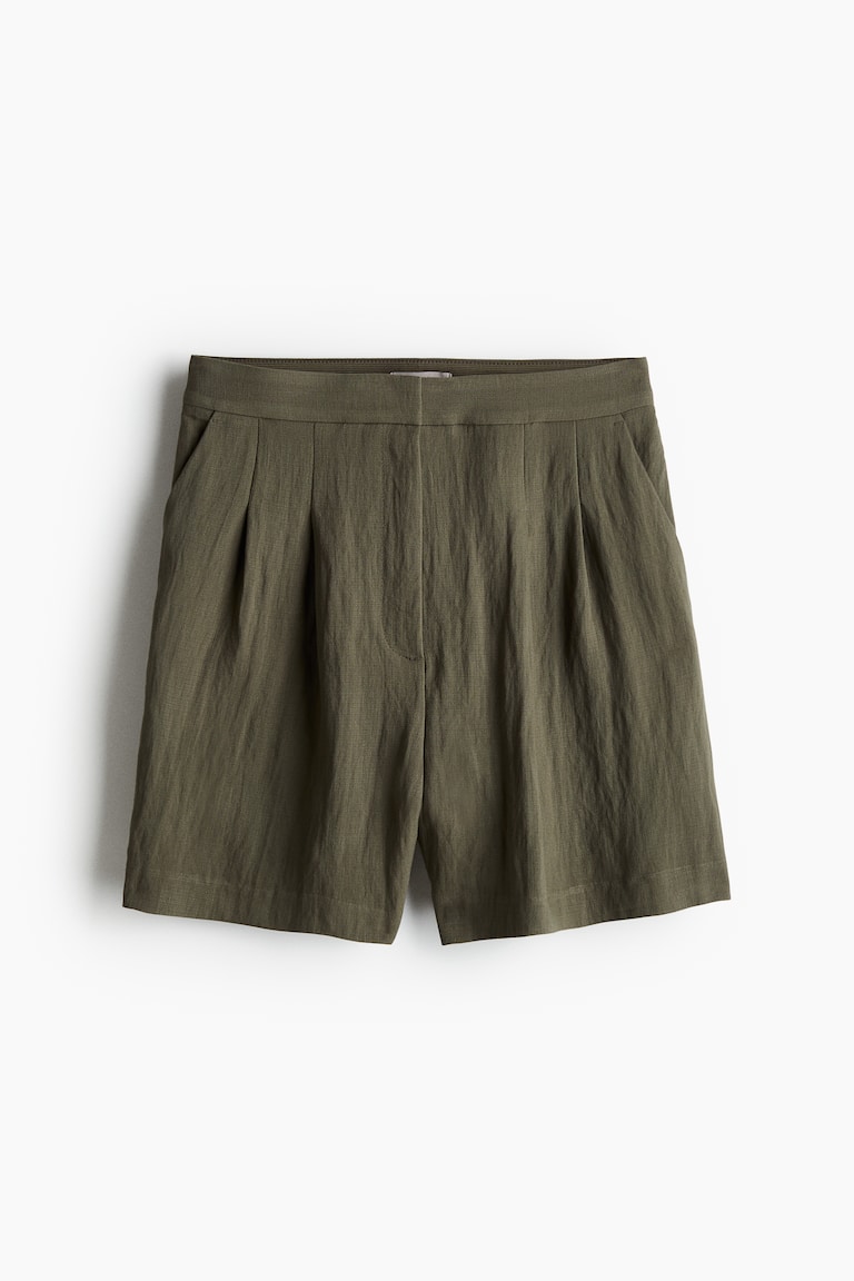 Loose-fit shorts in woven fabric. High waist, pleats at front, and zip fly with concealed button and hook-and-eye fastening. Diagonal side pockets and mock welt back pockets.