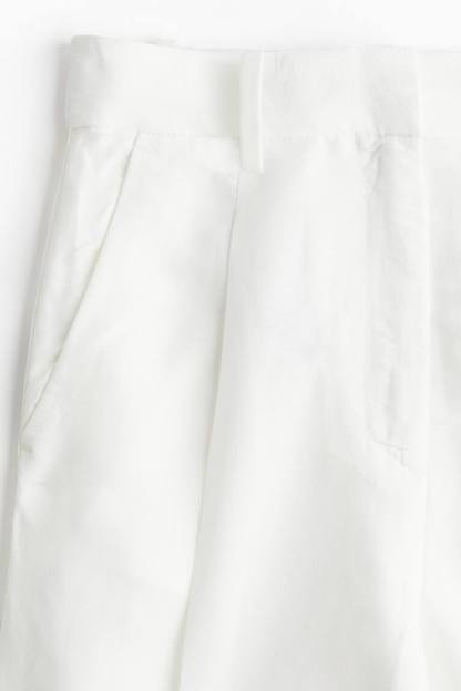 Shorts in an airy, woven linen and viscose blend. Regular waist, zip fly with concealed button and hook-and-bar fastener, and covered elastic at back of waistband. Pleats at front, diagonal side pockets, and creases at front and back.