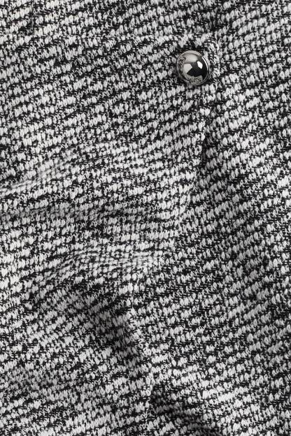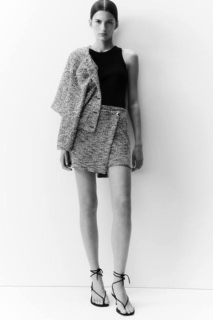 Short skort in textured jersey. Elasticized waistband, darts at back, and sewn wrapover front with decorative button.